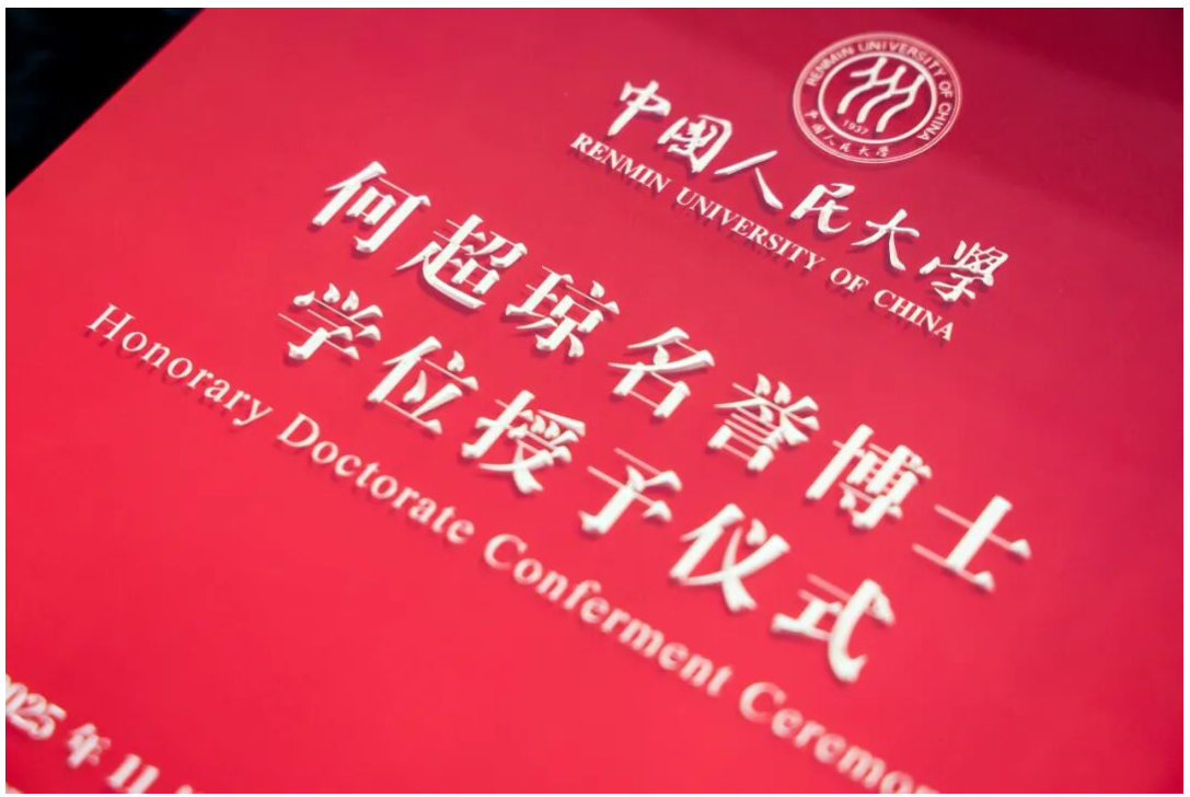 张东刚在致辞中表示,何超琼女士是爱国爱港爱澳的杰出人士,是粤港澳大湾区融合发展、创新发展、改革发展的创新力量,也是富有情怀的艺术、文化、旅游事业产业推动者。中国人民大学有着光荣的办学传统和红色基因、优秀的艺术教育传统和学科基础,名誉博士不仅是学术桂冠,更承载着“让党放心、不负人民”的精神品格、“独树一帜、勇走新路”的高远追求和“扎根中国、胸怀人类”的世界情怀。授予何超琼女士名誉博士学位不仅是对她卓越成就的崇高致敬,更是对她与人民大学“精神同频、价值共振”的高度认同。期待与何超琼女士及港澳各界同仁一道,坚持为国育才之本、拓展文明交流之界、紧跟国家战略之需,学习好贯彻好党的二十届四中全会精神,为全面建成社会主义现代化强国、实现第二个百年奋斗目标贡献教育力量、知识力量、人才力量。